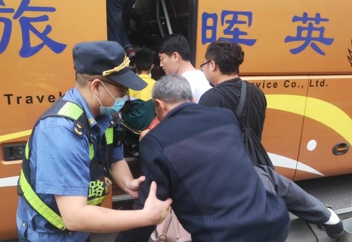 司机重新启动车辆,检查刹车有效后便通知乘客上车,路政员则认真协助引导乘客跨过护栏上车。
