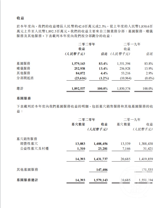 记者注意到,墓穴销售是福寿园的支柱性业务,墓穴销售与相关服务收益15.79亿元,占营收比重的83.4%。殡仪服务收益2.52亿元,比重为13.4%。