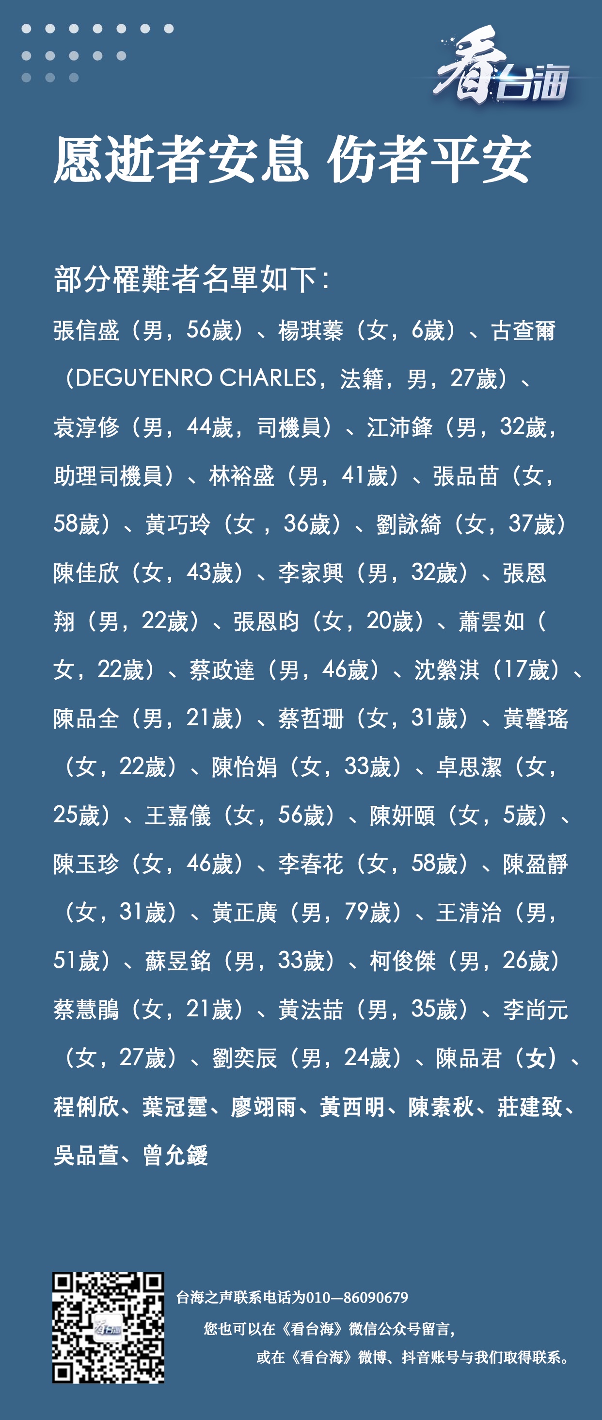 4月2日台铁“太鲁阁号”408次列车出轨事故部分罹难者名单如下: