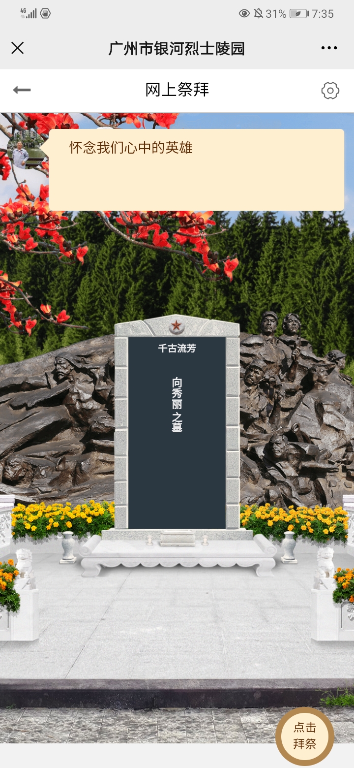 先人骨灰安放在银河革命公墓的市民,可通过网络搜索“广州市银河烈士陵园线上拜祭流程”或关注微信“广州市银河烈士陵园服务号”进行网上祭扫。祭扫平台点击“公众拜祭”输入逝者姓名,在拜祭页面,可实现献花、献茶、留言等祭扫功能,满足广大市民悼念逝者、寄托哀思、缅怀先人的需求。祭扫烈士的市民,可点击“烈士祭扫”,选择烈士图片(或搜索功能)进入烈士拜祭大厅网页,瞻仰烈士生平、纪念文章、追思留言以及网上祭扫,为广大烈属和社会各界网上祭扫缅怀英烈提供便利。