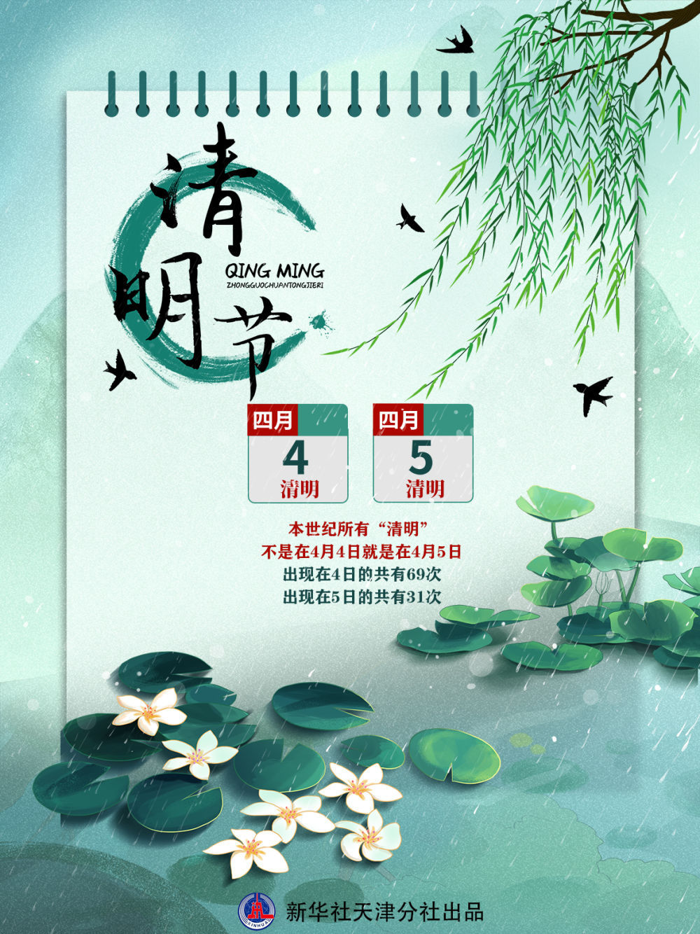 20世纪100年的统计显示,“清明”出现在4月4日共有7次,4月5日共有79次,4月6日共有14次。21世纪100年的统计显示,“清明”只有4月4日和4月5日这两天,没有4月6日。其中,“清明”出现在4月4日共有69次,出现在4月5日共有31次。综合这200年的情况来看,4月5日“清明”是出现最多的,因此我国民间有“四五清明”的说法。