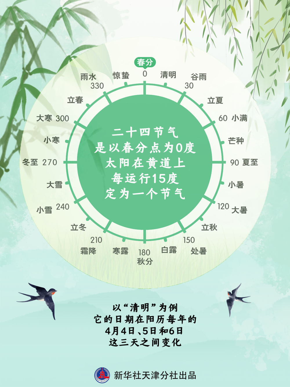 中国天文学会会员、天津市天文学会理事赵之珩介绍说,二十四节气的划分,起源于黄河流域,是中国传统历法的重要组成部分。最初的二十四节气是把一个回归年(365.2422天)的日数等分成24份。自清代开始,定以春分点为0度,太阳在黄道上每运行15度定为一个节气。每月会有两个节气,其中,月首叫“节气”,月中叫“中气”。上半年的节气发生在阳历每月的6日或21日左右,下半年的节气发生在阳历每月的8日或23日左右,上下相差不了一两天。以“清明”为例,它的日期在阳历每年的4月4日、5日和6日这三天之间变化。