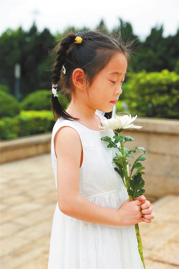 一名小女孩在深圳革命烈士纪念碑前默哀。