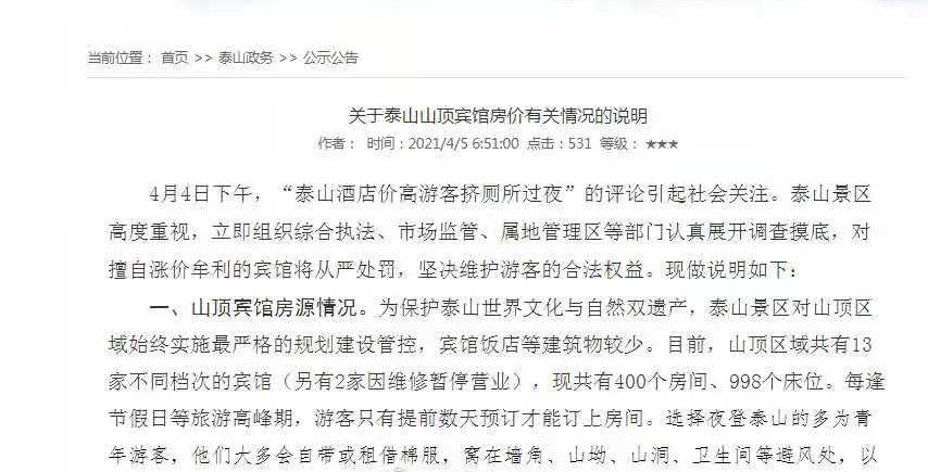 昨日,网友反映“清明假期期间,泰山山顶南天门附近住宿1200元一间,有游客在厕所过夜的情况”。对此,今天泰山景区管委会进行了回应。