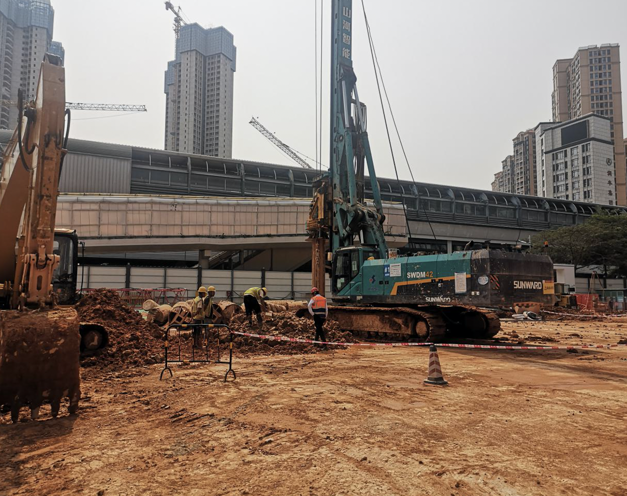 自今年1月起,龙华投控集团党委坚持党建引领项目建设,牵头组织了建设、监理、施工、设计、勘察、第三方监测、桩基检测等七家单位成立项目专项小组、临时党支部,推出“项目部+党支部”协同作战模式。专项小组以党建工作为纽带,凝聚各方聚力,开展了大量的前期准备工作,经过多方多轮讨论确定工程桩施工方案,前往同类项目调研学习,开工前进行试桩施工,优化设计参数,编制五方联动防疫预案,做好日常消杀工作、体温测量、出入工地登记、防疫物资发放,确保项目以“保省优、创国优”为任务目标全力推进工程进度。