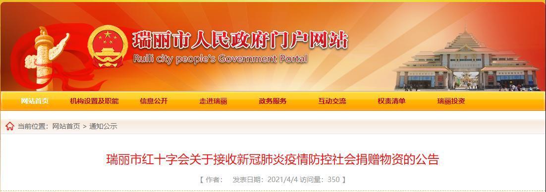 云南瑞丽市红十字发布《瑞丽市红十字会关于接收新冠肺炎疫情防控社会捐赠物资的公告》,为支持瑞丽市抗击新冠肺炎疫情,瑞丽市红十字会特开通捐赠热线,接收医用耗材等防护设备、巡边值守物资及社会捐款。