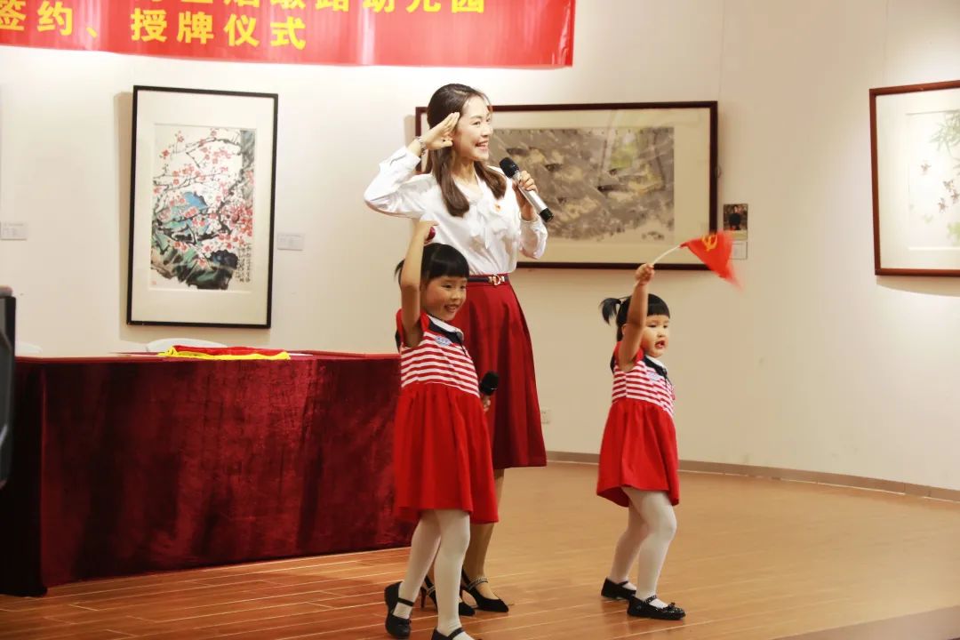仪式中,烟墩路幼儿园合唱团的小朋友们合唱了《祖国多美丽》、独唱《学习雷锋好榜样》、亲子合唱《幸福来自七月一》等歌曲。通过孩子们的歌声渲染全场,飞扬的歌声,吟唱出对祖国的热爱之情。沉甸甸的牌匾,凝聚着对祖国的热爱之情。