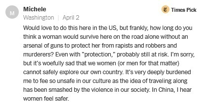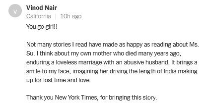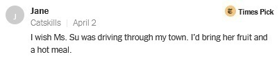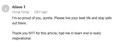 4月2日,纽约时报报道了苏阿姨的故事,并称她为一名“无所畏惧的公路旅行者”。而在这篇文章的评论区里,400多条评论,为了独自上路的苏阿姨“欢呼”。