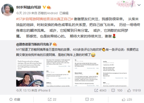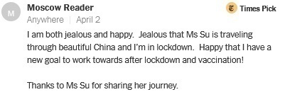 2021年4月2日,纽约时报报道了苏敏阿姨的故事。仅仅一天时间,文章下就有400多条评论,为这名“独自上路”的中国阿姨欢呼。评论里有不少人都在羡慕苏阿姨能在疫情期间出游,而自己还在经历疫情的“封锁”。还有人表示,十分羡慕中国的治安。