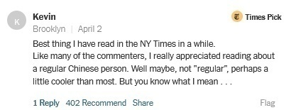 我近期在纽约时报读过的最好的文章。像许多评论者一样,我真的很想阅读关于中国普通人的文章。嗯……也许不是“普通的”,她比大多数人酷一点。但你知道我啥意思。
