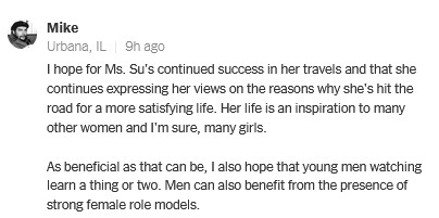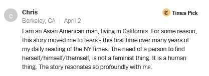 我是个在美国的亚裔男性,在加州居住。这故事让我流泪——在我读纽约时报的这么多年里。人们对寻找自我的需求,不仅仅是女权的议题,这是人类的议题。这故事让我产生了自豪的共鸣。