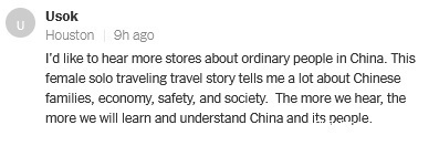 我想听听更多关于中国普通人的故事。这个女性独自旅行的故事告诉我很多关于中国家庭、经济、安全和社会的事情。我们听到的越多,就能越了解中国和中国人。