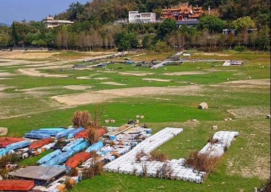 台湾日月潭水位大降,干旱、缺水问题持续引发危机。有台网友分享日月潭近照,只见潭底干枯,土色地面已龟裂成块状。