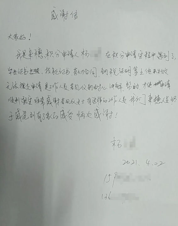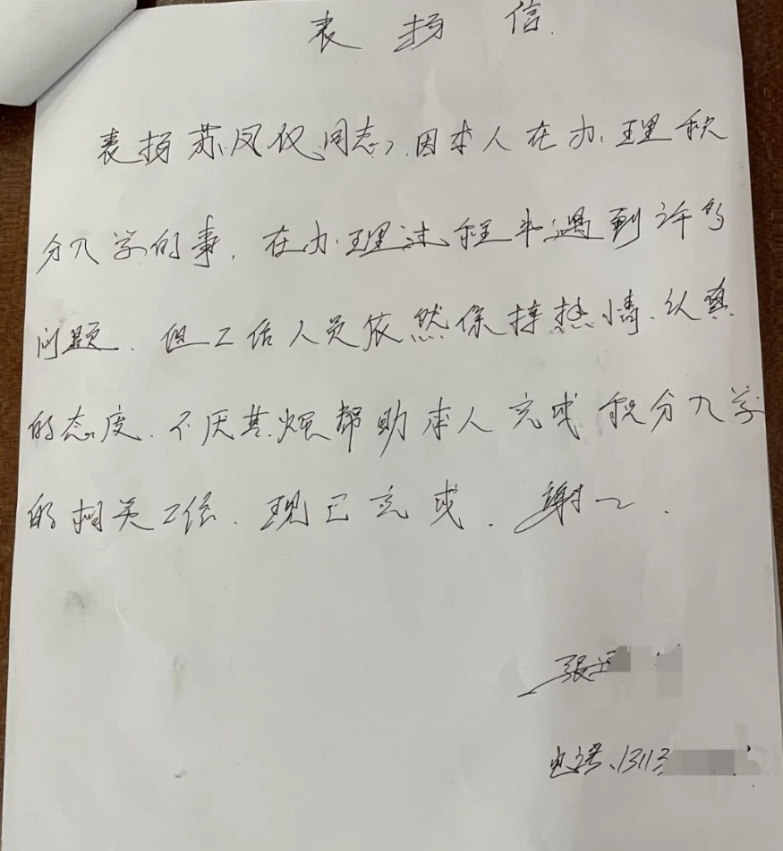 苏凤仪的耐心和热心也得到了来穗人员的肯定。杨先生表示:“有这样的工作人员,我们来穗人员终于感觉到有了家的感受。”“工作人员保持热情、认真的态度,不厌其烦帮助本人完成积分入学的相关工作,谢谢。”另一名来穗人员张先生也在3月24日的感谢信中向工作人员表示了感谢。