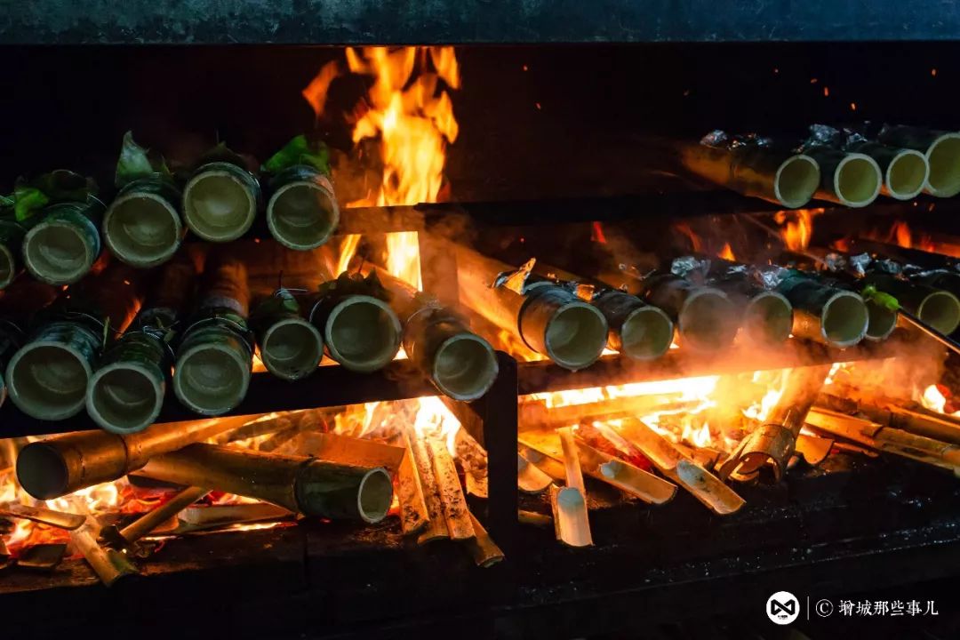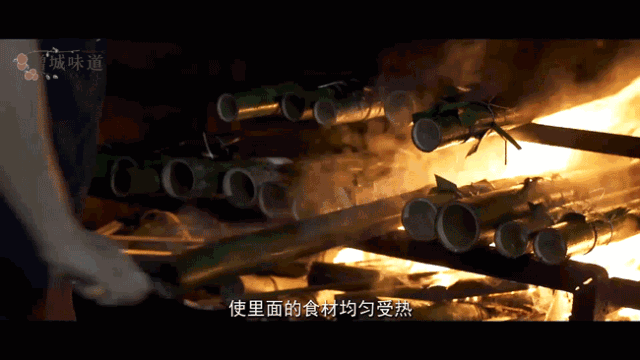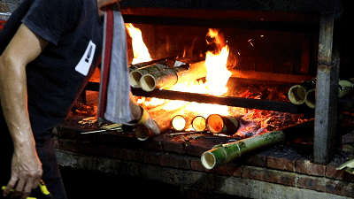 #3. 火候的精准掌握是一份竹筒饭的关键。烧烤竹筒的过程中,竹子会自动排出里面的水分只留下精华,厨师则要不断摇晃竹筒使其均匀受热,防止断竹或烤焦。