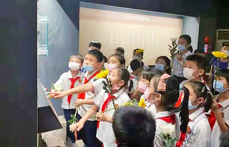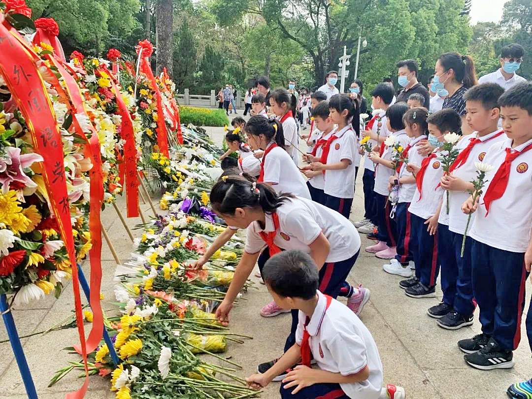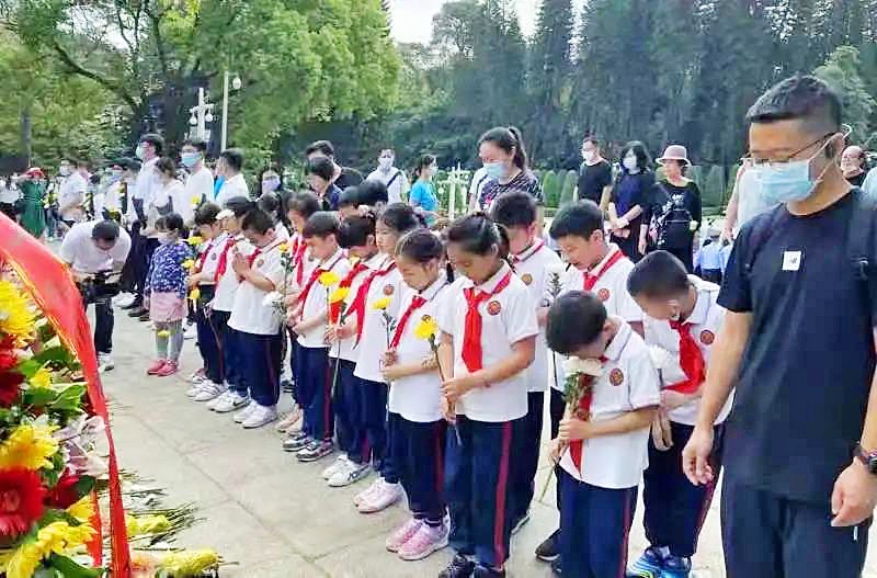 同学们依次来到烈士墓前,向烈士敬献鲜花。面对着革命烈士的陵墓,孩子们轻轻地走上前,献上带来的菊花。他们神情庄重,默默追思那段战火纷飞的岁月,表达对革命先烈的敬仰之情。