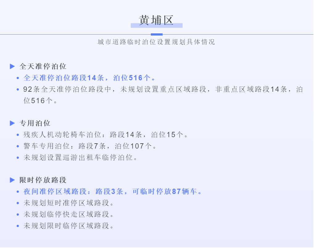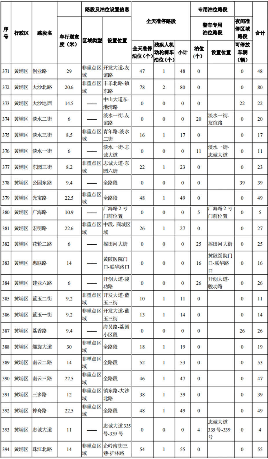 其中,黄埔区全天准停泊位路段14条、泊位516个、夜间准停区域路段3条,可停放87辆车。