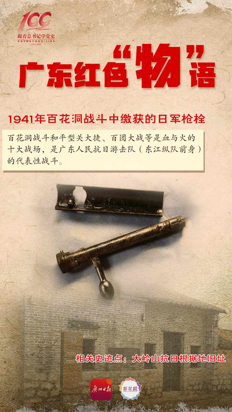 广东东江纵队纪念馆罗慧娴告诉记者,东江纵队纪念馆珍藏着两件文物,是2016年由东江纵队战士卢锋同志的家属捐赠的,这两件文物就是1941年百花洞战斗中缴获日军三八式步枪的枪栓和防尘盖。当年百花洞战斗持续了两天一夜,游击队击毙了日军大队长长濑和几十个日军官兵,缴获了一批枪支弹药。枪栓就是百花洞战斗最好的历史见证物。