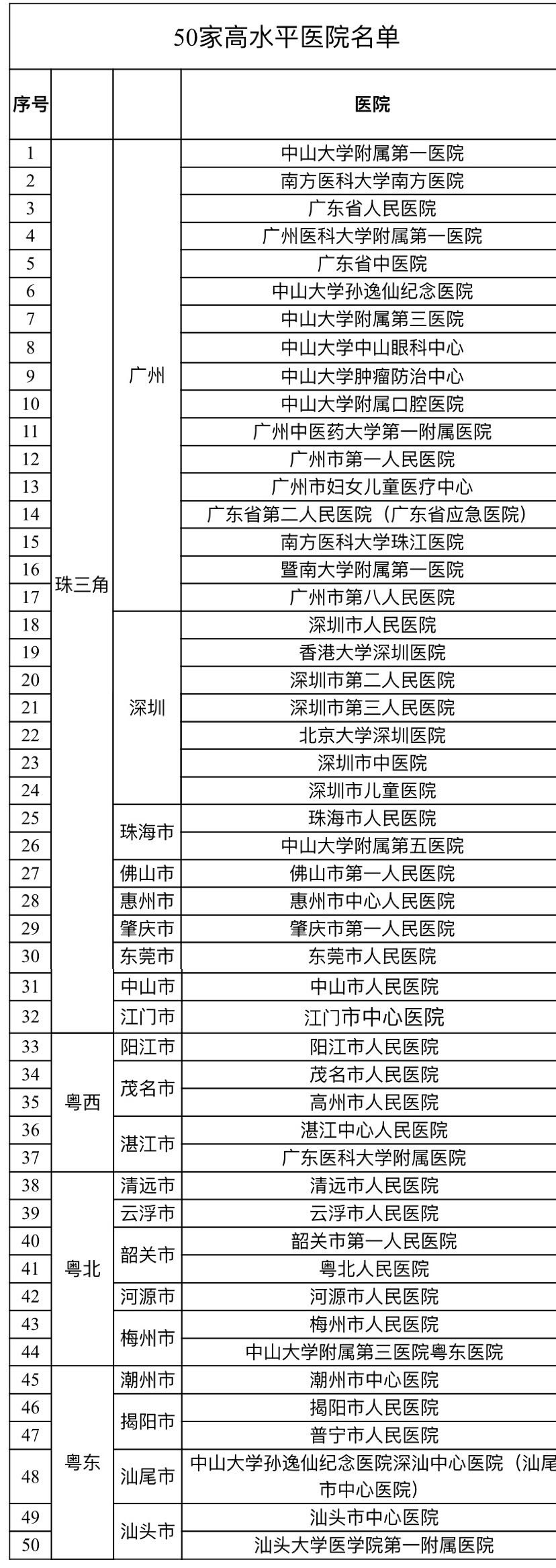 省50家高水平医院,从区域来看,广州市有17家,深圳市有7家,除广州、深圳外珠三角地区8家,粤东西北地区18家。从医院分类来看,综合医院40家,中医院3家,传染病、妇儿各2家,眼科、肿瘤、口腔各1家。实现了全省21个地市高水平医院建设全覆盖,高水平医院分级分类科学均衡发展。