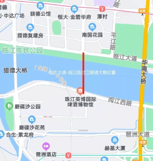 近日,记者来到临江大道马场路交界处看到,道路车流量较多。从临江大道带状公园向珠江对面,可以看到唯品会、阿里巴巴大楼。目前,市民从猎德过江需要绕行猎德大桥或华南大桥,尤其是华南大桥拥堵不堪。过江隧道建成后,将增加一条“捷径”,可直接从马场路直通琶洲,驾车仅需2分钟。