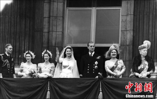 资料图为1947年11月20日,英国女王伊丽莎白二世和菲利普亲王在白金汉宫举行婚礼。60多年前,菲利普亲王在女王的加冕礼上并没有戴王冠,而是跪在女王身前,紧握她的双手,发誓做她“忠实的臣子”。