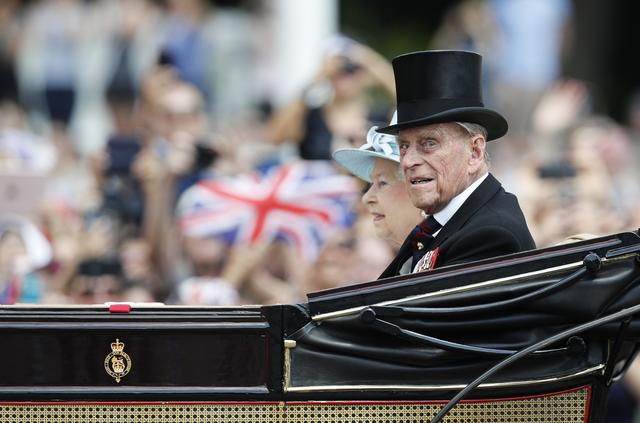 这张2017年6月17日拍摄的资料照片显示,在英国伦敦,英国女王伊丽莎白二世和丈夫菲利普亲王乘坐马车离开白金汉宫,准备观看阅兵式,庆祝女王91岁官方生日。新华社记者韩岩摄最后时光在温莎城堡和女王一起度过