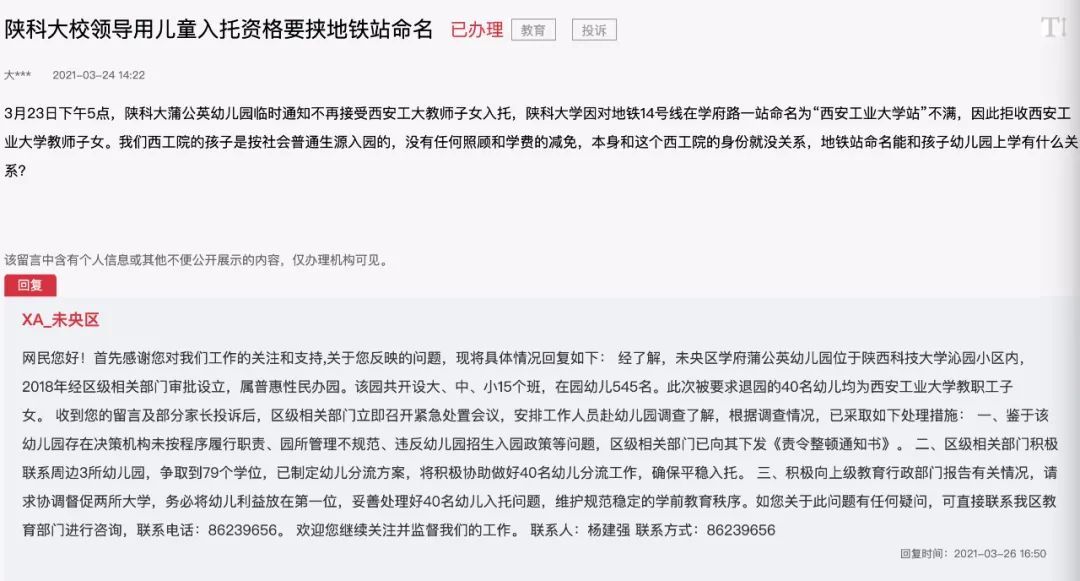 针对西安工业大学教师子女入托问题,西安市未央区教育局在对网友的答复中确认了上述属实。