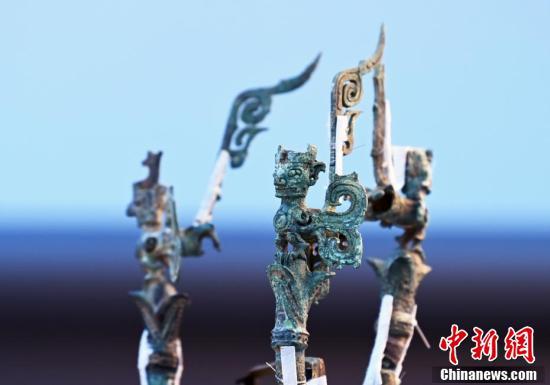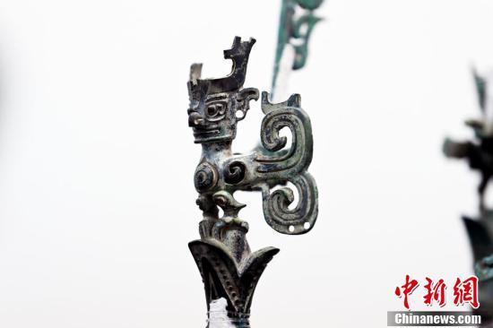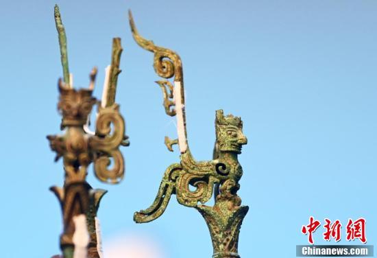 4月8日,四川省广汉市,记者走进三星堆博物馆文保中心用镜头记录正在修复的三星堆遗址出土的3号青铜神树初步修复情况。图为3号青铜神树的顶部头像。