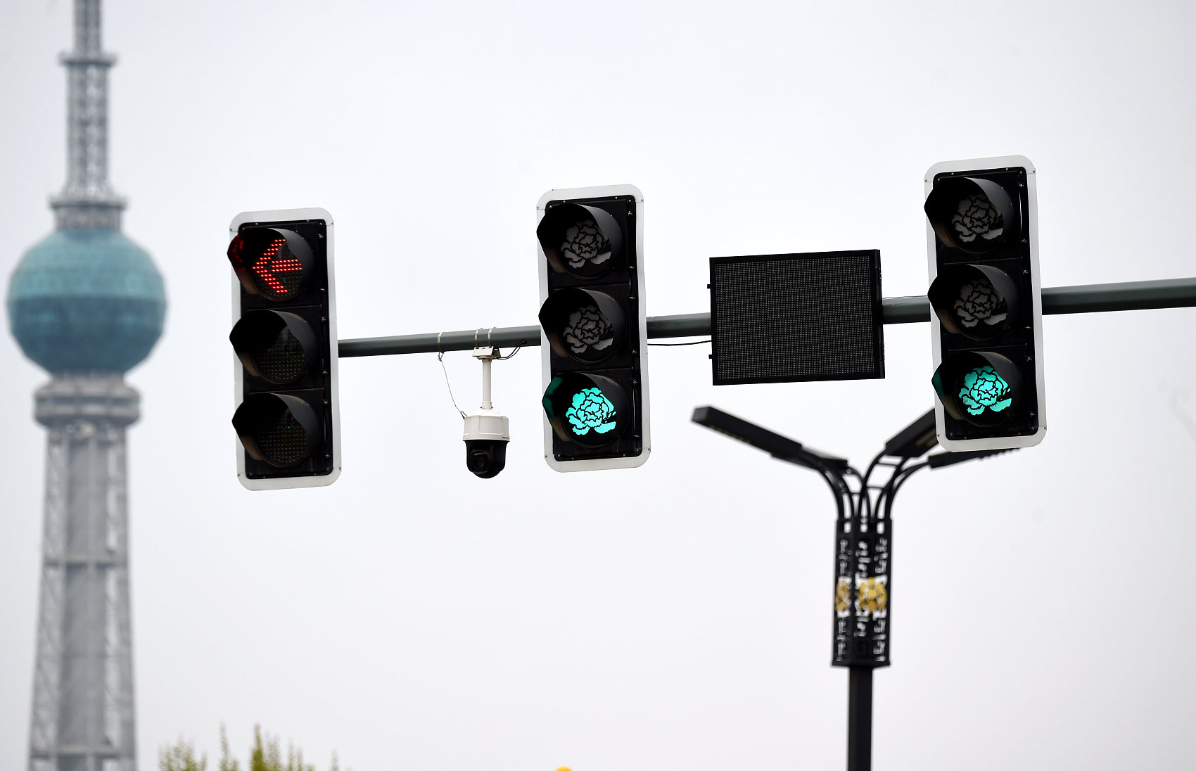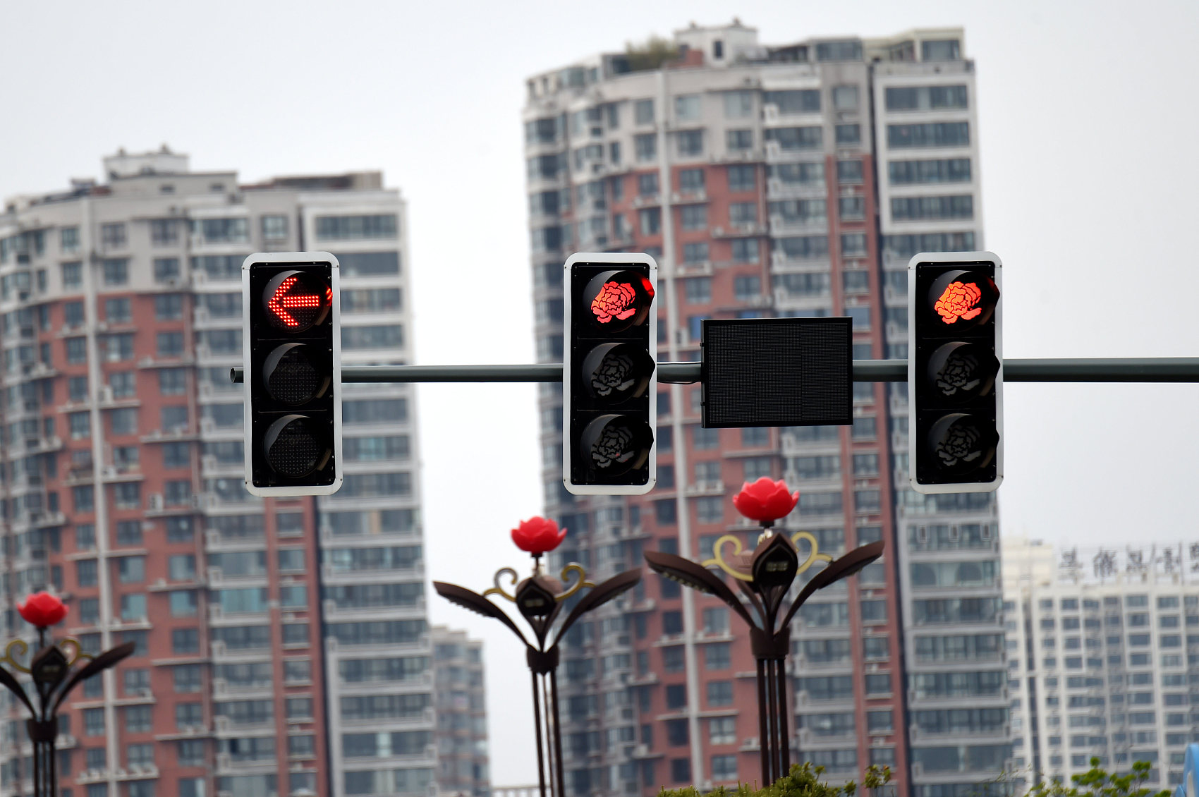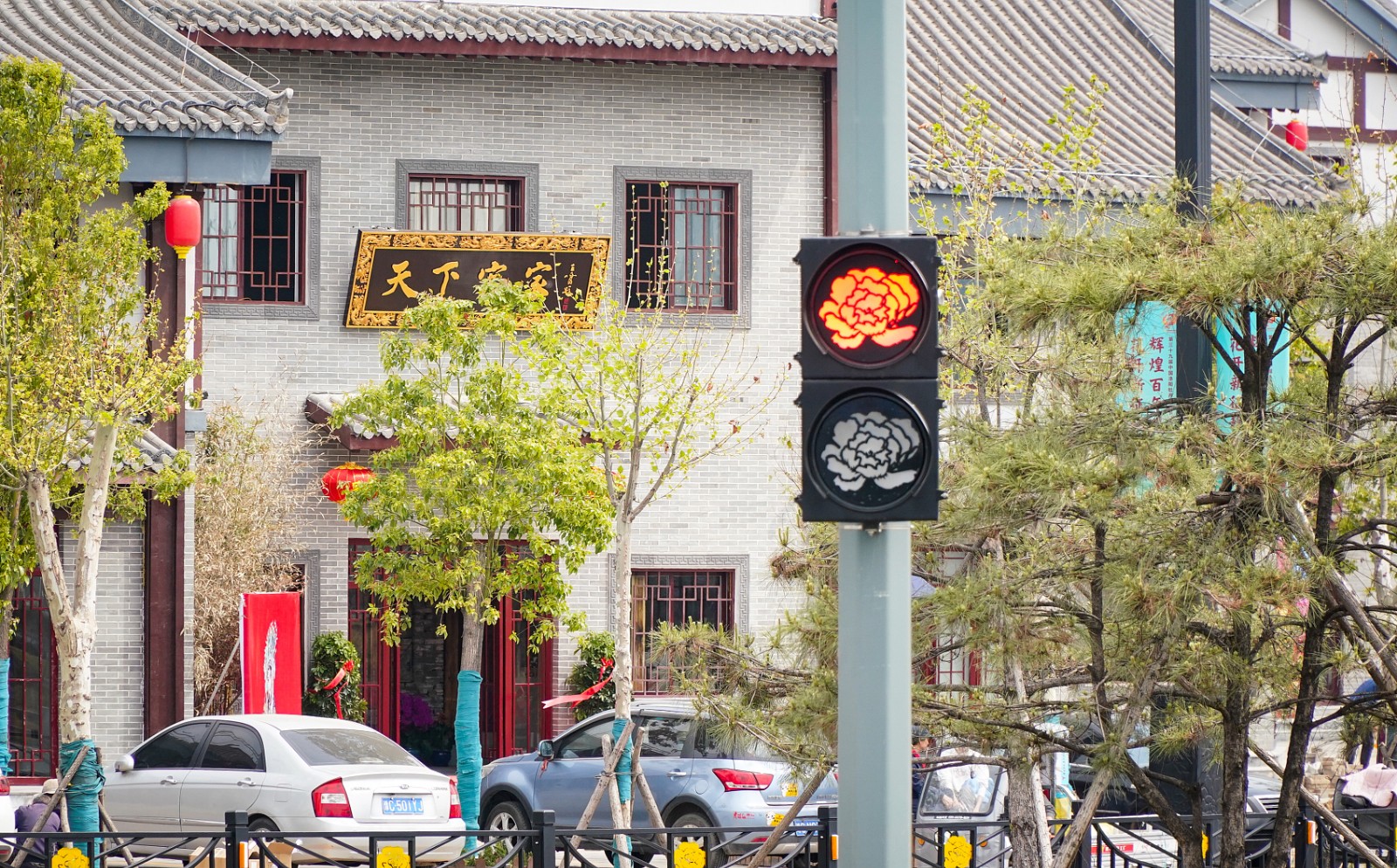 2021年4月9日,河南洛阳,第39届中国洛阳牡丹文化节开幕之际,部分路口红绿灯变成牡丹形状。红牡丹停,绿牡丹行,创意深受当地好评。有市民表示,开车走路路边都画有牡丹图案,感觉非常新奇,变化很大。