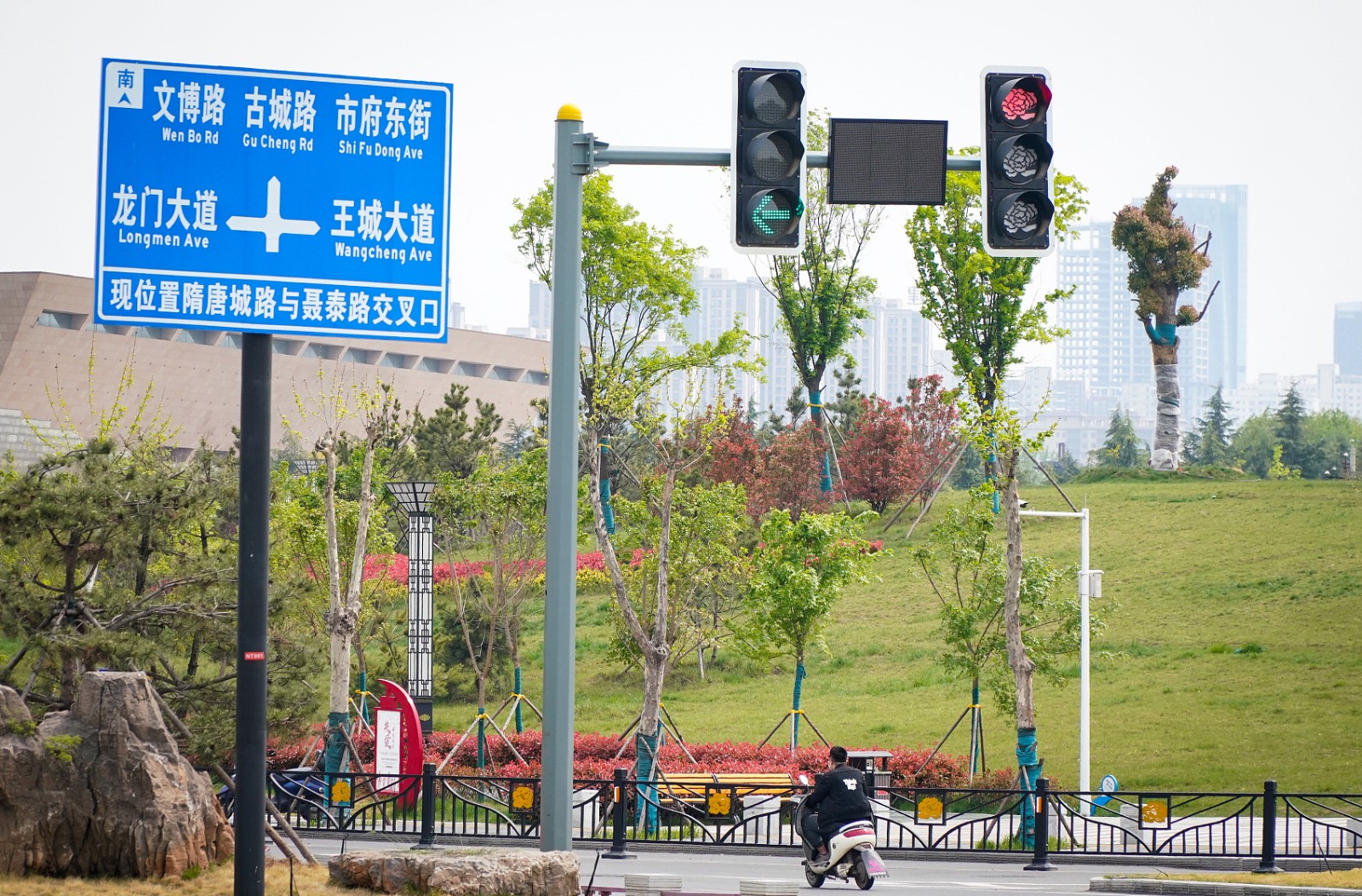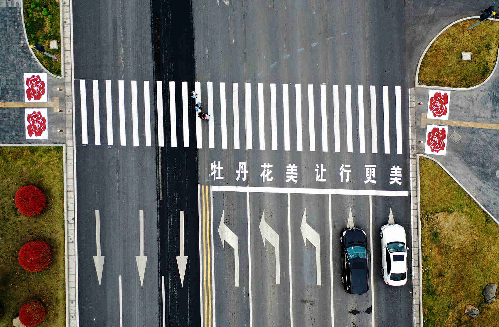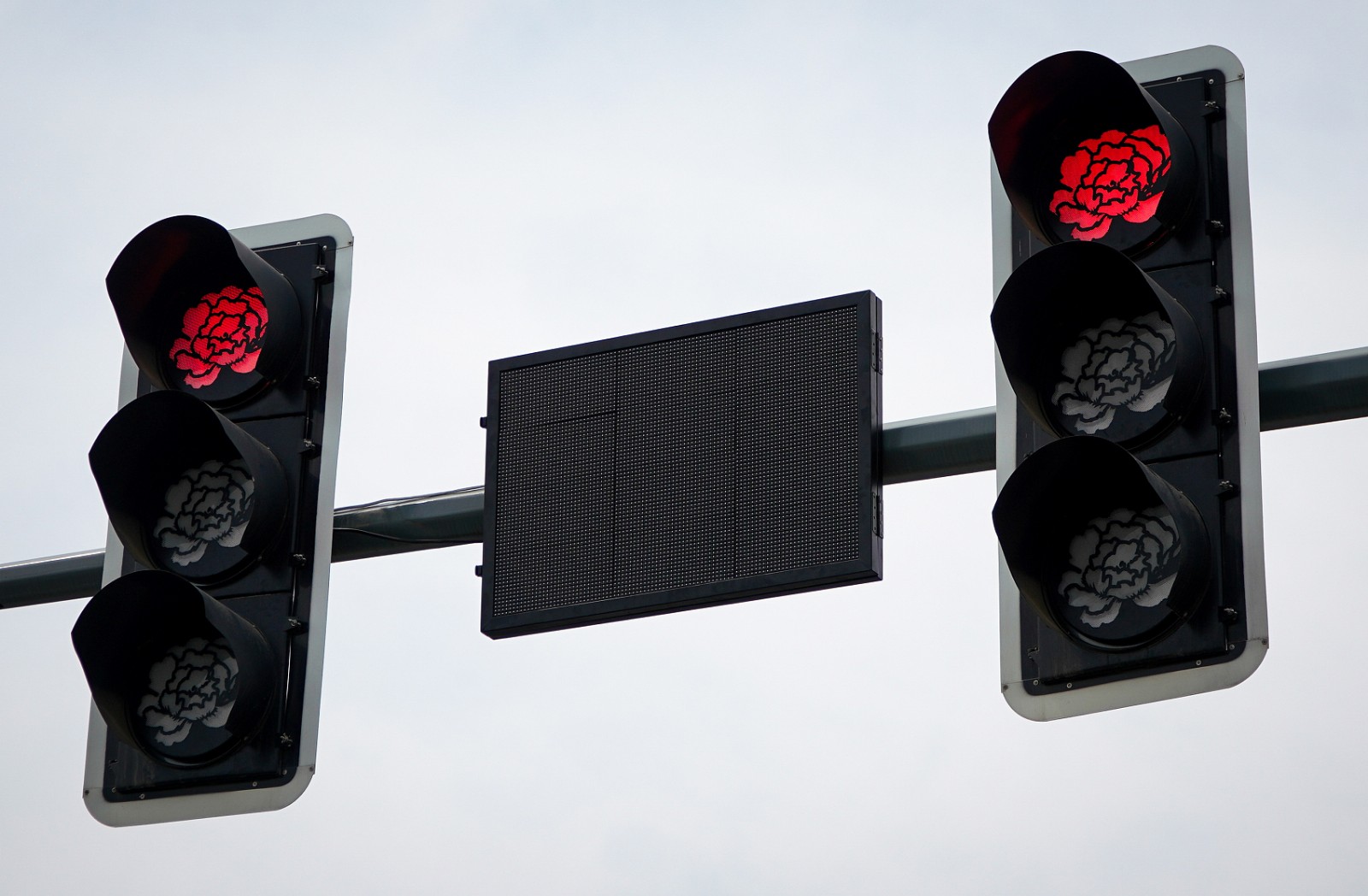 2021年4月9日,河南洛阳,第39届中国洛阳牡丹文化节开幕之际,部分路口红绿灯变成牡丹形状。红牡丹停,绿牡丹行,创意深受当地好评。有市民表示,开车走路路边都画有牡丹图案,感觉非常新奇,变化很大。