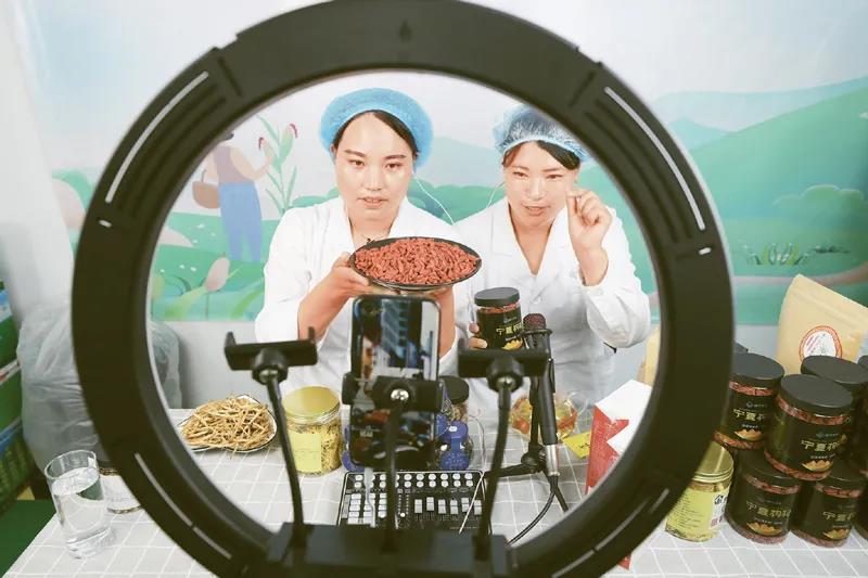 “闽宁禾美”是在闽宁扶贫协作推动下,在宁夏闽宁镇原隆村建设的一个消费扶贫品牌和电商孵化基地。该基地通过“企业+扶贫车间+贫困户”的模式,引领特色产业发展,让村民就近就业,稳定脱贫致富。图为2020年6月11日,村民在家门口的电商扶贫车间直播销售当地特色农产品。中新社记者 于晶/摄
