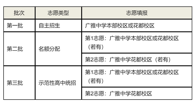 2021年本部校区和花都校区在第一批、第二批、第三批进行招生,东江广雅学校在第四批招生,建议按下表填报志愿(仅供参考)。