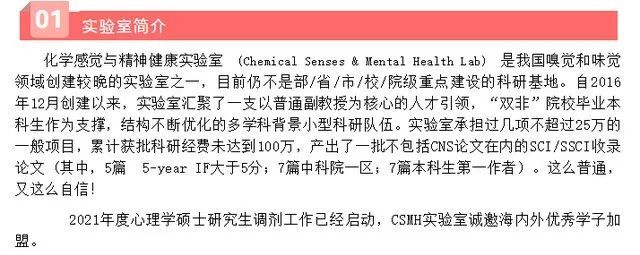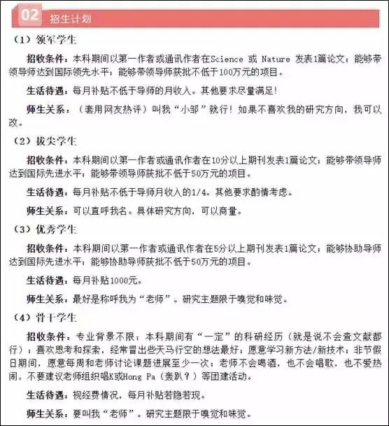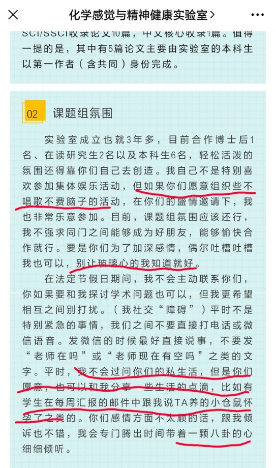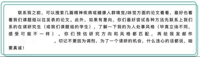此外,在2020年9月该公号发布的《化学感觉与精神健康实验室(邹来泉课题组)招收推免硕士研究生1-2名》一文中,作者就提到,“今年各大心理学牛校推免生招生力度极大,大胆猜测我今年招收到推免生的希望渺茫。抱着试一试的心态!万一有学生在‘北大、北师大、华师和(南方医)’这四个选项,反复纠结,艰难地放弃了我……至少有这么一次离牛校那么近”、“目前我们有不太充足的经费,本着‘再苦不能苦孩子,再穷不能穷教育’的崇高理念,我不会克扣研究生补贴,社恐的我也努力去谈了些MRI合作,基本可以确保实验开展”……