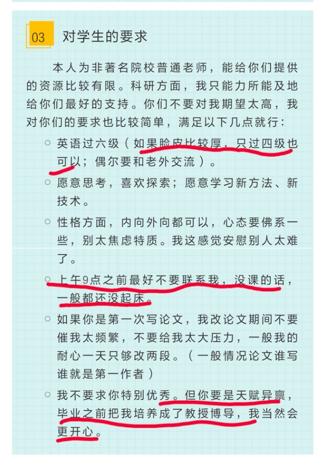 邹来泉不要求学生特别优秀,“如果脸皮比较厚,只过四级也可以”“上午9点之前最好不要联系我,没课的话,一般都还没起床”。