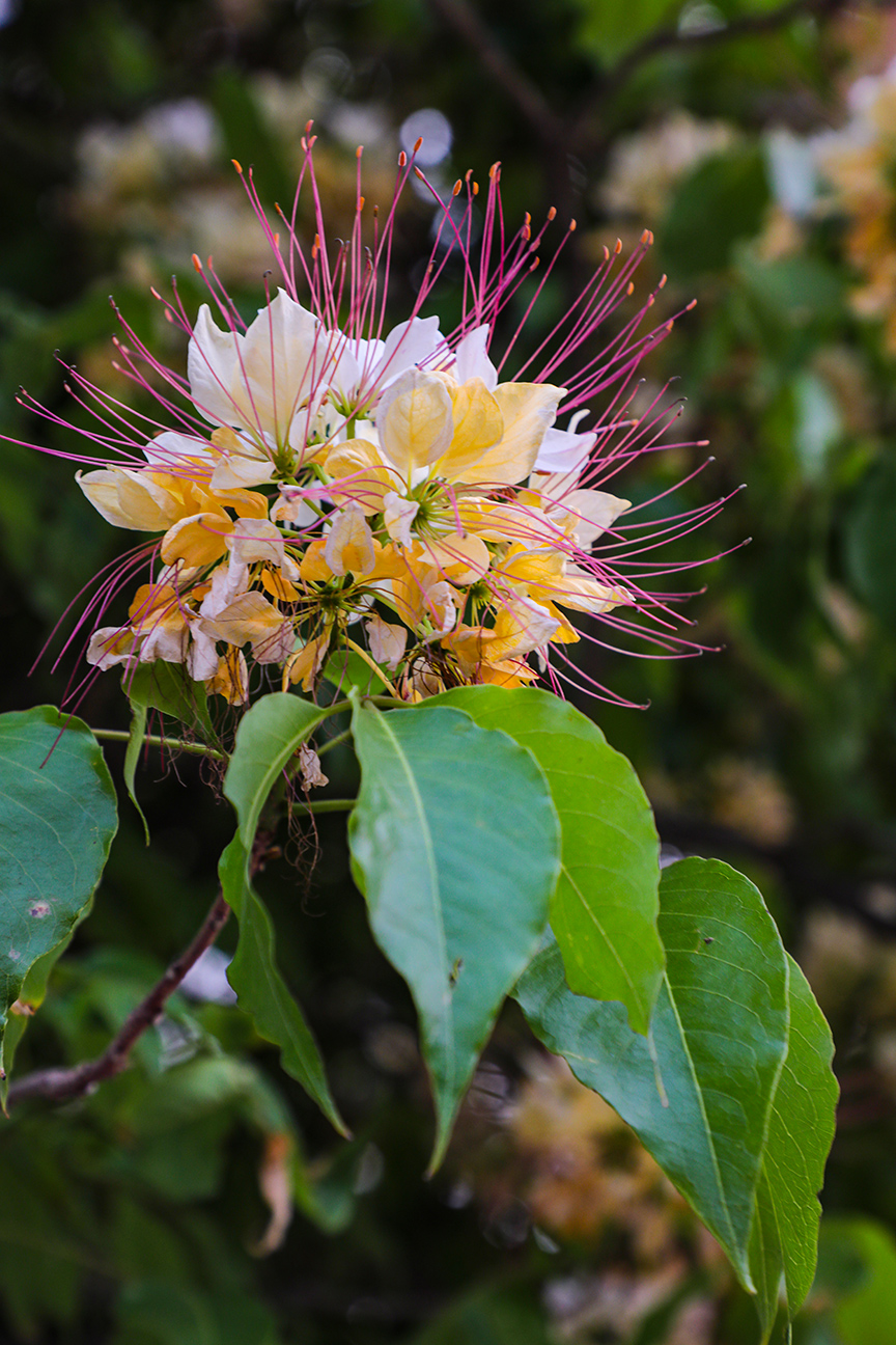 据介绍,鱼木是落叶乔木,春季先展叶,后开花,花期长达1个多月。鱼木开花,花比叶多,满树金黄。花蕾吐艳时,花瓣呈雪白色;几天后,花瓣转为金黄色。紫红色的长长的花丝犹如蝴蝶的触须,微风吹拂,花蕊和花冠随风飞舞,吸引众多的蜜蜂和蝴蝶,穿插花丛采蜜。