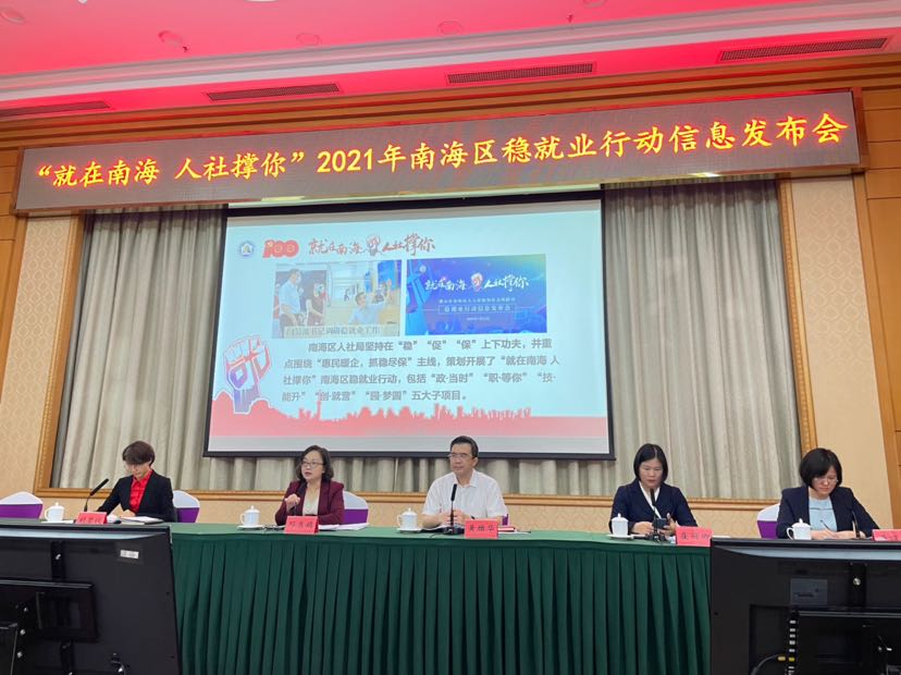4月12日,“就在南海 人社撑你”2021年南海区稳就业行动信息发布会举行,佛山市南海区人社局在大会上发布“职惠+”“创就+”“政当+”“技能+”“园梦+”五大主题项目,从公共就业服务提升、创业带动就业、职业技能提升等多个方面入手,促进南海就业形势持续稳定、长期稳定。