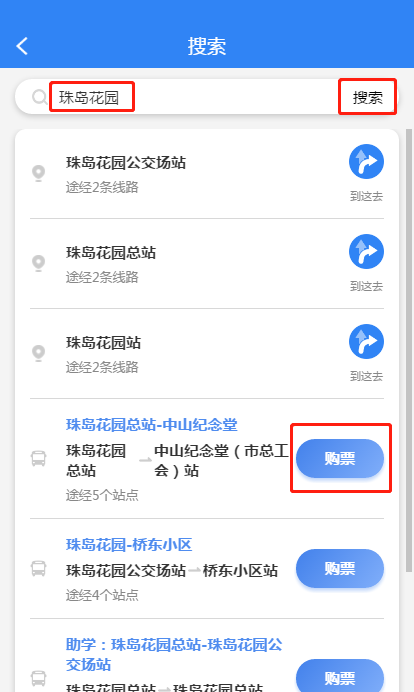 3.在搜索栏中输入您的出行目的地,进行模糊查询,选取您所需要乘坐的线路点击购票