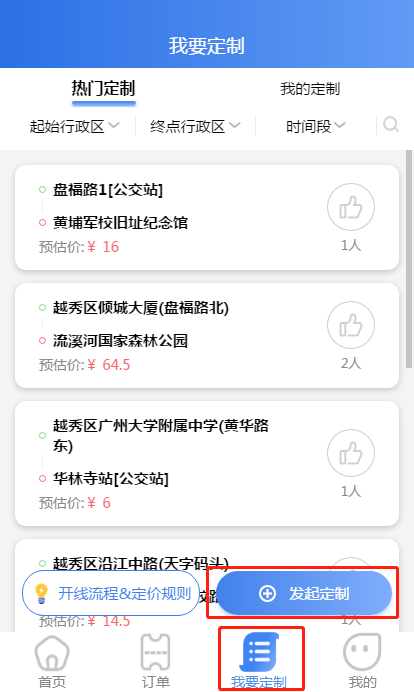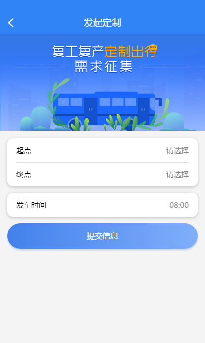 选择我要定制,点击发起定制,输入起点、重点、发车时间等信息,当定制需求满足一定条件时,我们将有专人与您联系。