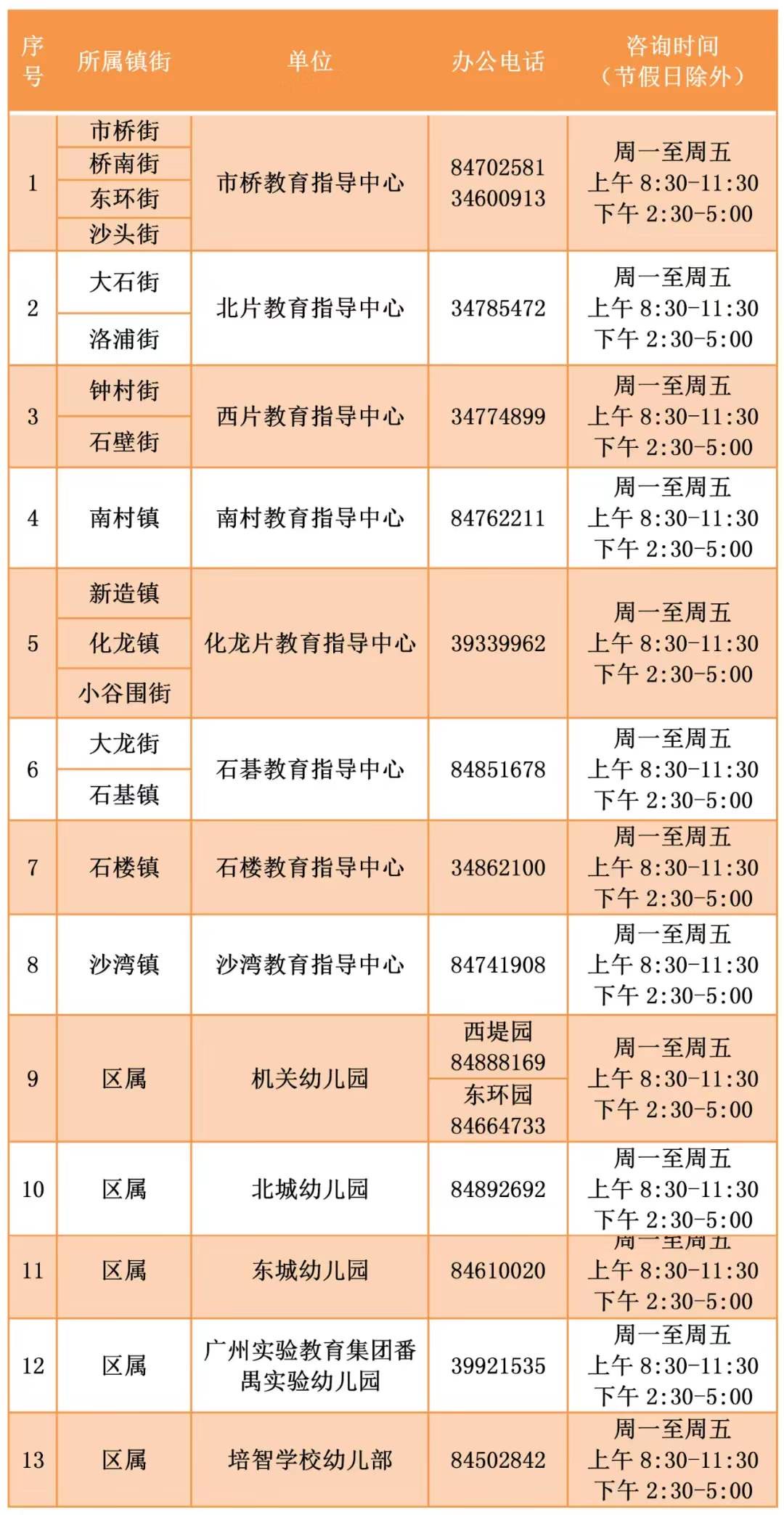 (一)番禺区各镇街、区属幼儿园招生工作单位、咨询电话一览表。