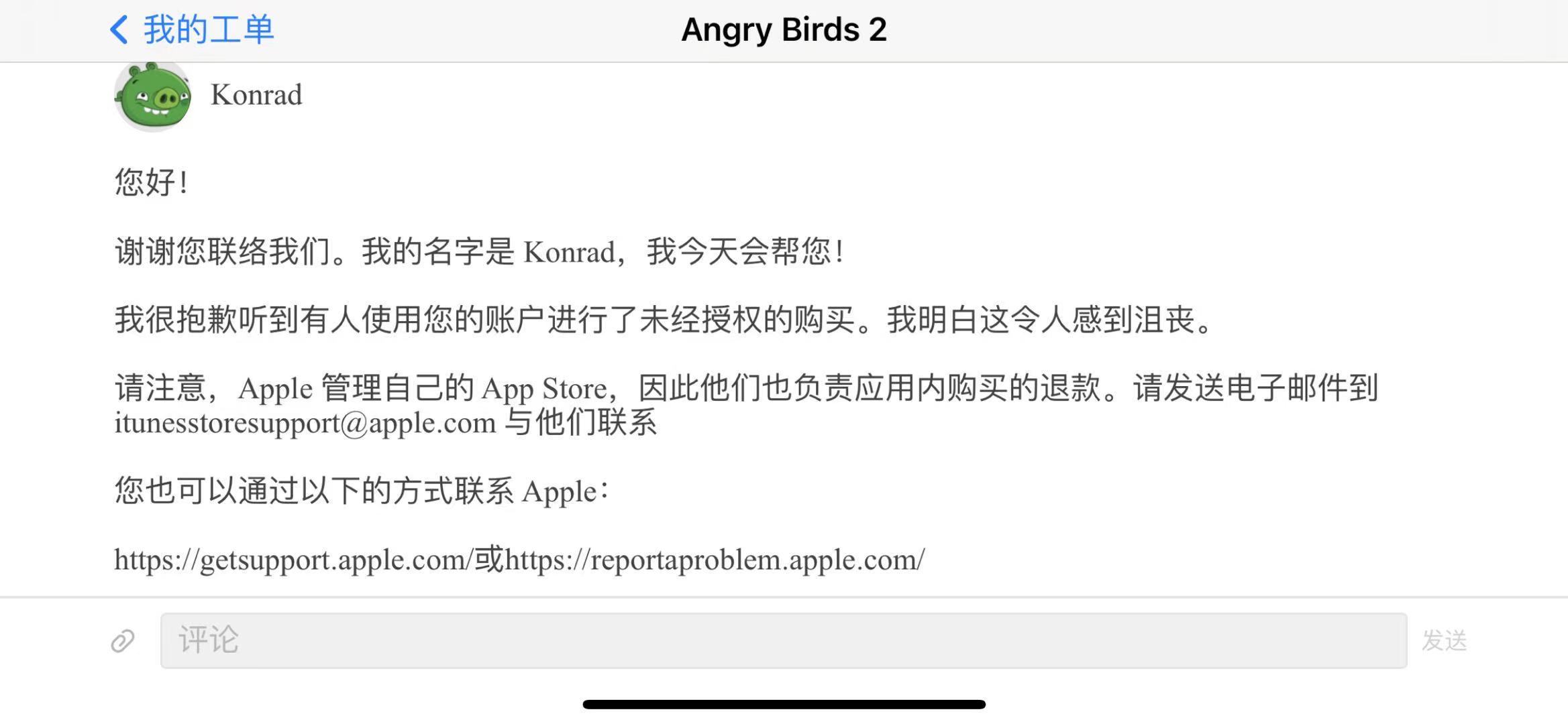 发现儿子在游戏中大额充值后,顾女士联系到游戏开发公司Rovio玩家支持团队,反映情况并申请退款。该公司工作人员回复称:“Apple管理自己的App Store,因此他们也负责应用内购买的退款。”