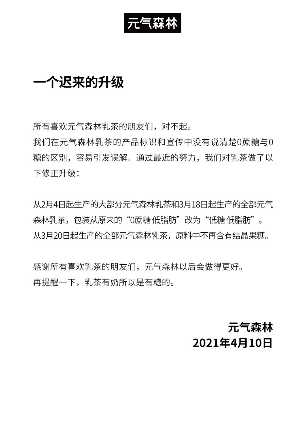 日前,元气森林在官方微博上发布一则题为《一个迟来的升级》的公告,称在乳茶产品的产品标识和宣传中没有说清楚“0糖”和“0蔗糖”的区别,容易引发误解。最近对乳茶做了修正升级,从2月4日起生产的大部分乳茶和3月18日起生产的全部乳茶,包装从原来的“0蔗糖 低脂肪”改为“低糖 低脂肪”。从3月20日起生产的全部元气森林乳茶,原料中不再含有结晶果糖。
