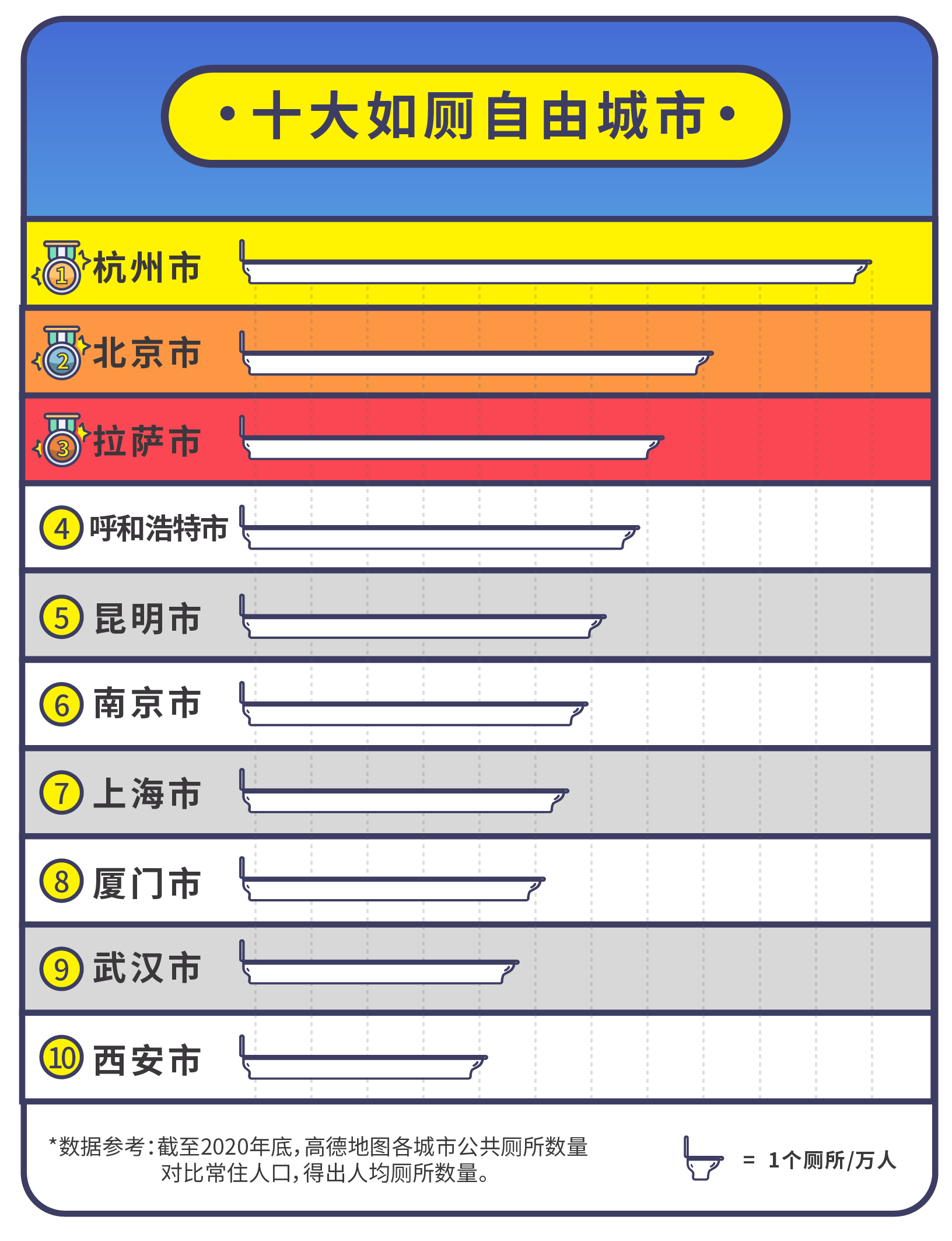 对比各城市的常住人口,杭州是人均拥有厕所个数最多的城市,可谓享实现了如厕自由。其他进入十大如厕自由城市的分别是北京、拉萨、呼和浩特、昆明、南京、上海、厦门、武汉、西安。