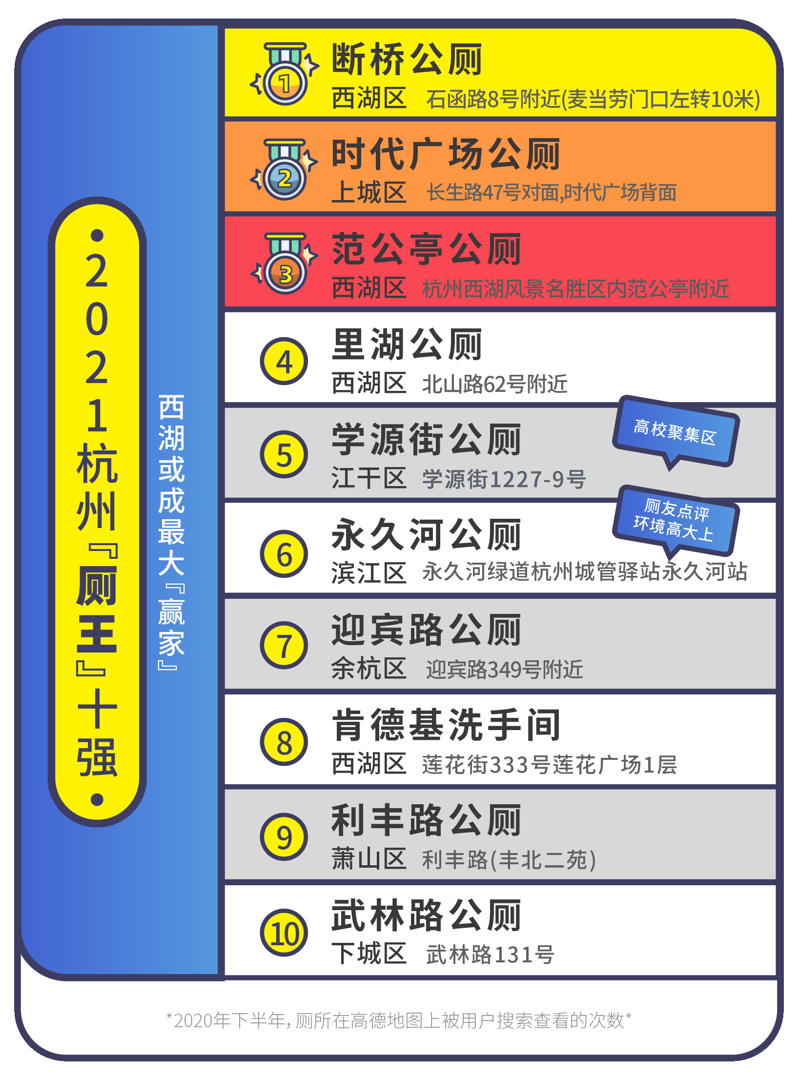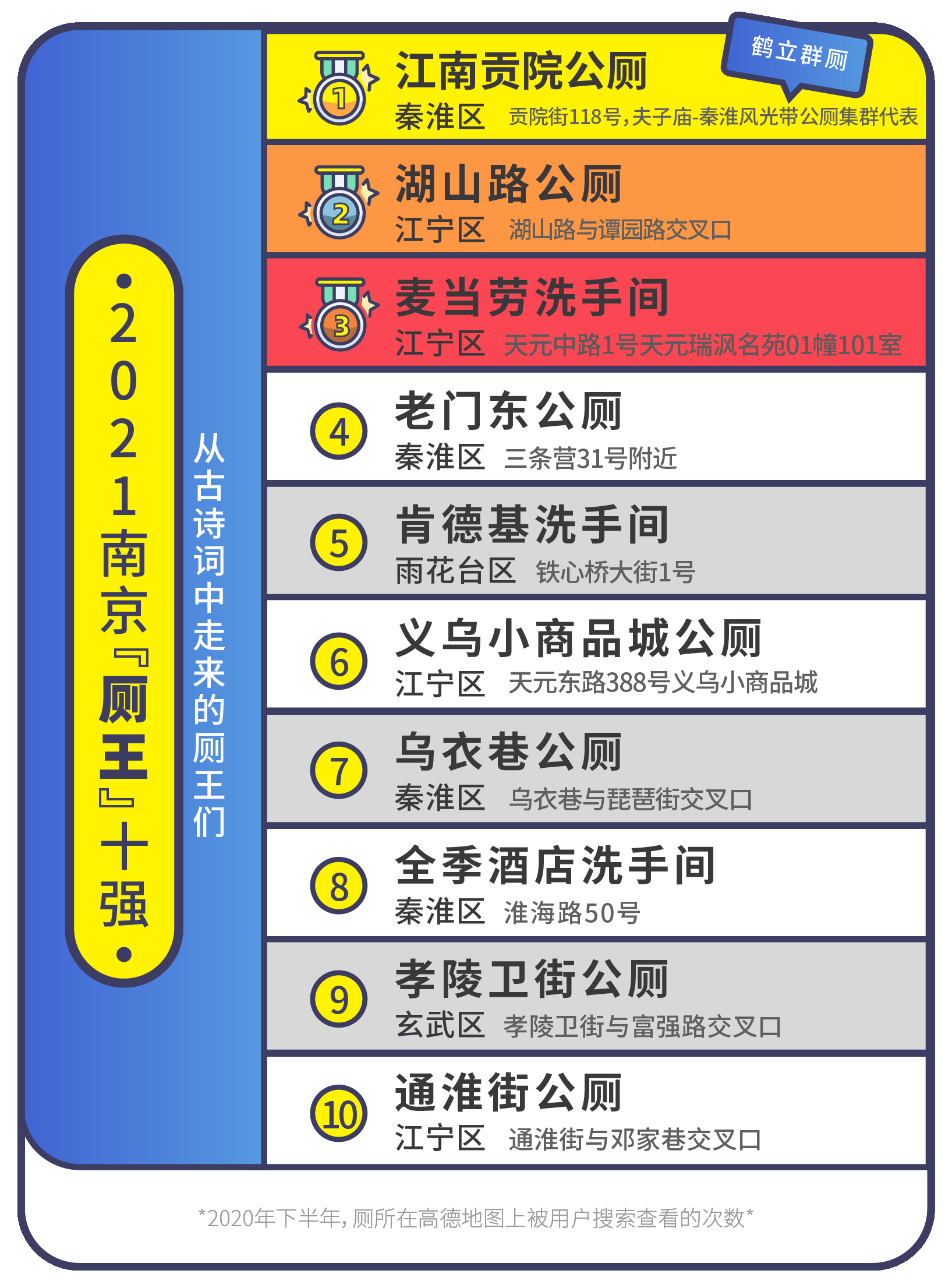 根据2020年下半年,各城市厕所在高德地图上被用户搜索查看的次数,图鉴分别评出了十个城市的“十大厕王”。用户通过高德地图搜索公共厕所,多为身处陌生环境,且没有直接发现厕所指示标识,“十大厕王”并不一定是城市中光顾人数最多的厕所,但是,在用户想去厕所又找不着时,他们是为最多人救急的厕所。