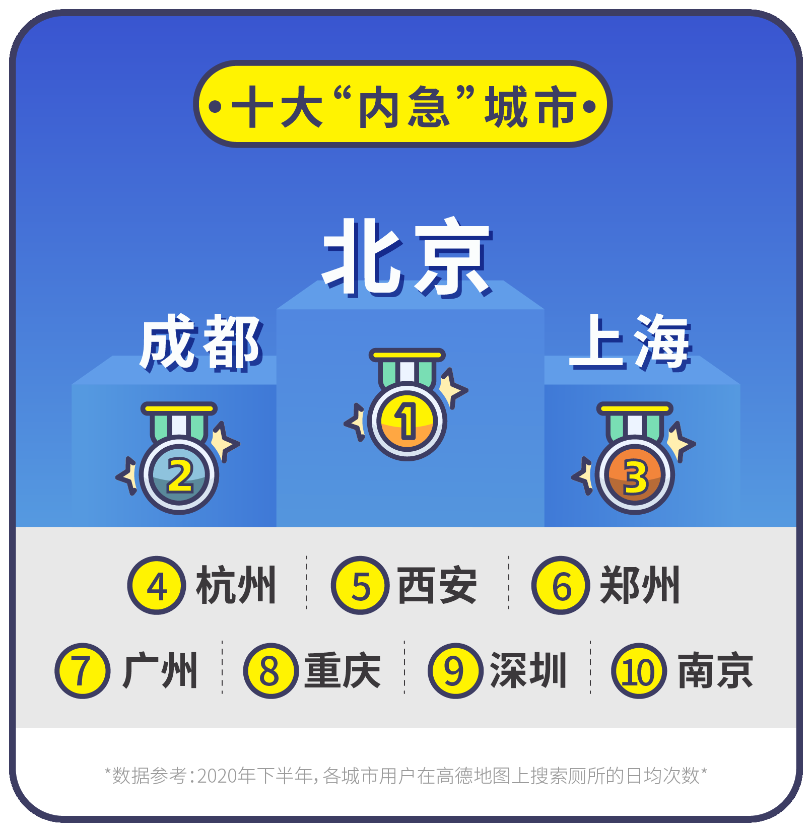 依照各城市用户在高德地图上搜索厕所的日均次数进行统计分析,北京、成都、上海、杭州、西安、郑州、广州、重庆、深圳、南京的厕所搜索次数最多,用户对公共厕所的需求最为旺盛,成为“十大内急城市”。