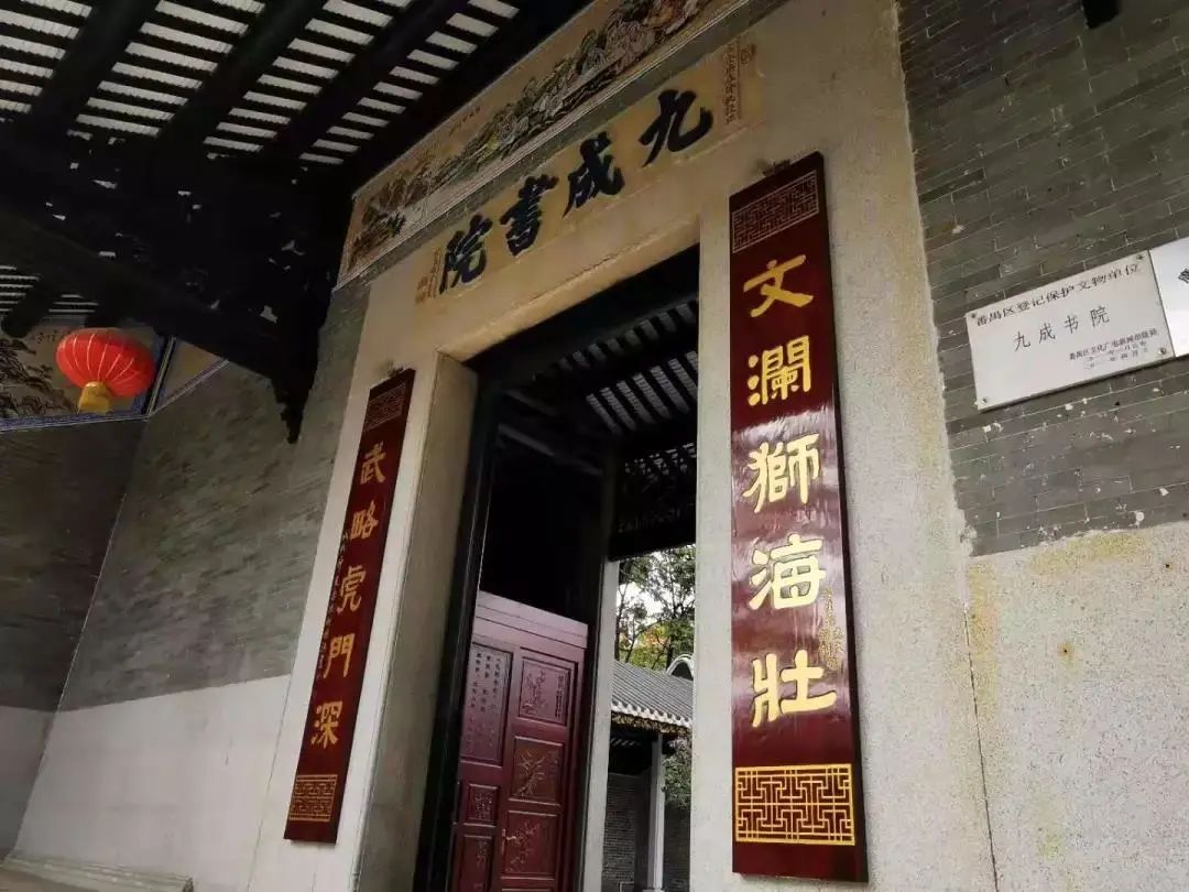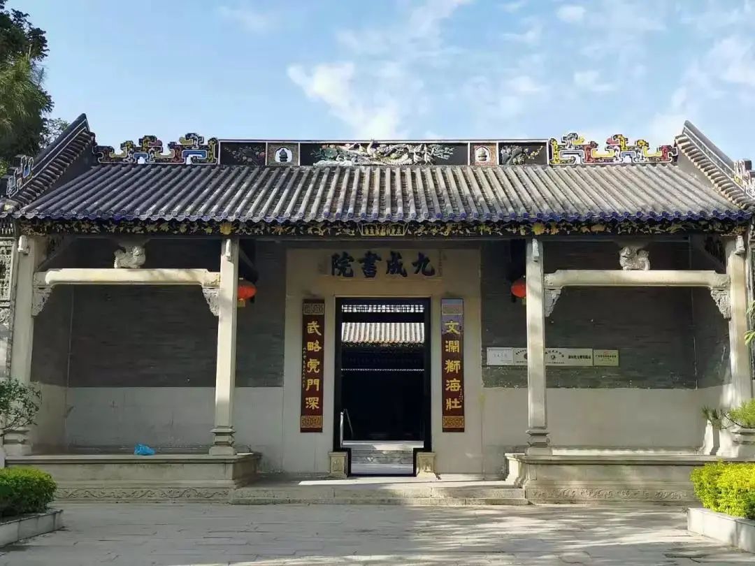 九成书院始建于清嘉庆二十五年(1820),“九成书院”四字由谢兰生所书,光绪乙巳年(1905)重修,2017年重修。书院原是九屯人(俗称“军籍人”)为其子弟兴建的读书场所。等语。据历史记录可知,这个九成书院不单是培养读书人的场所,而且是带有协防联盟性质的聚集地。