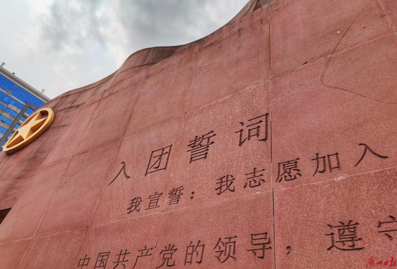 广州越秀南路与东园横路交界处,矗立着一座醒目的红砂岩雕塑。两个四边形基座承托着一面招展的团旗,仿佛一本打开的书。