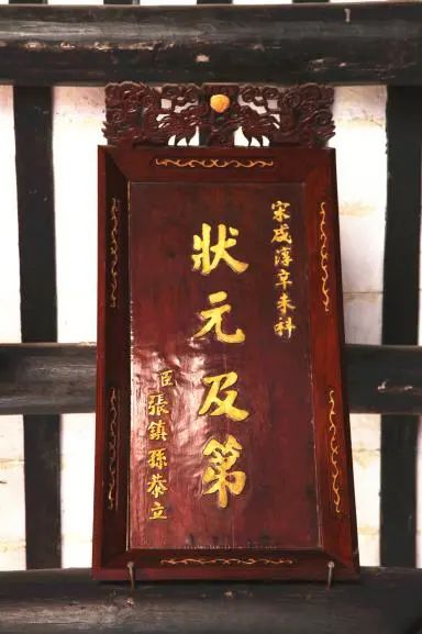 头门山墙端立扭头石狮一对,是纪念龙美四世祖南宋状元张镇孙所立。中堂悬挂众多匾额,记录着张氏先人显赫的功名,南宋“状元及第”、清咸丰年“振威将军”、清咸丰年“一等男爵加一云骑尉”。