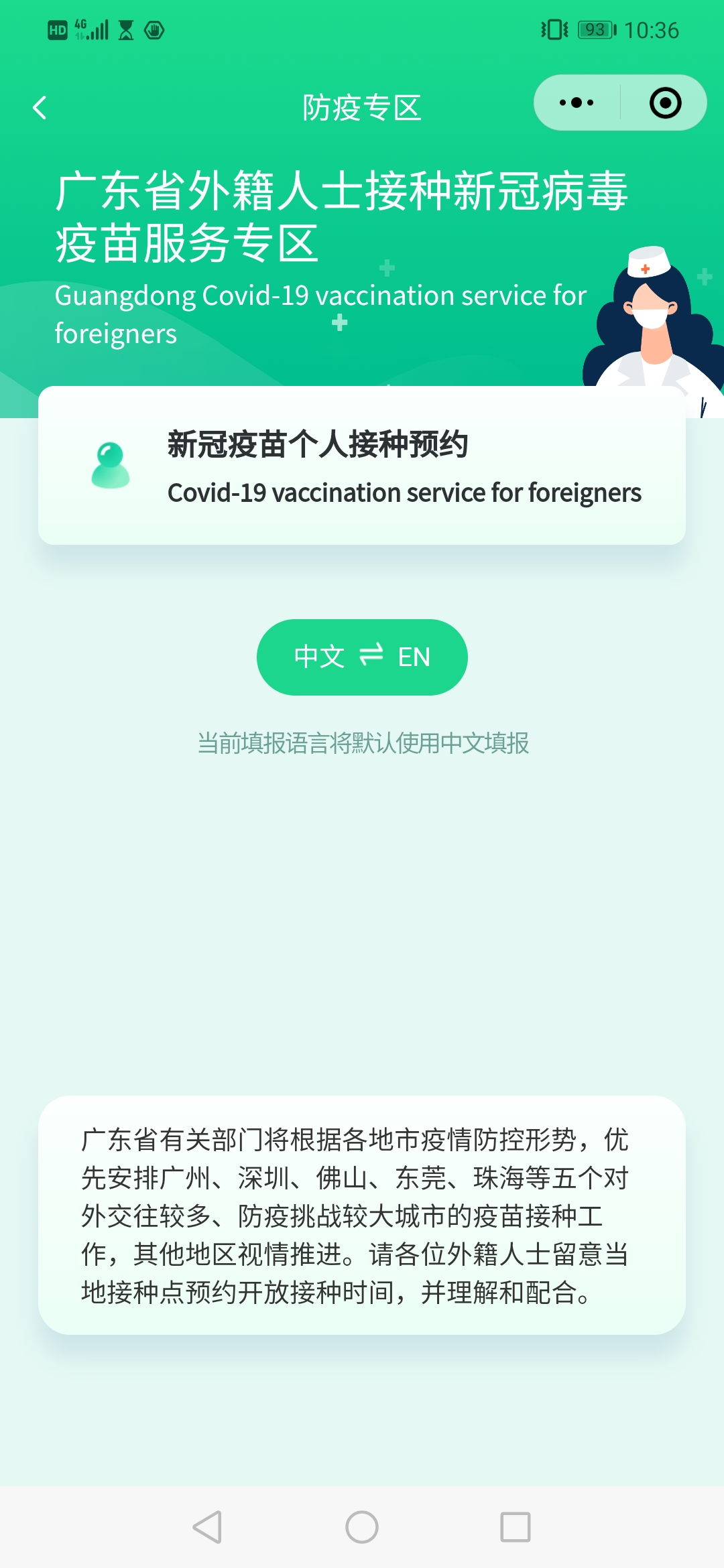 南方医院白云分院院长张永介绍,南方医院白云分院为广东省在粤外籍人士新冠病毒疫苗第一批定点接种点。外籍人士根据“知情同意、自愿自费、便利接种、风险自担”的原则,在“粤健通”微信小程序的预约页面,受种者填写本人的详细信息;预约成功后,受种者凭短信确认通知和预约二维码在指定时间、地点,携带有效身份证明及相关凭证前往我院,并做好个人防护并主动告知健康状况,由现场医务人员做好知情告知、信息登记、签署《知情同意书》、《免责承诺书》等。