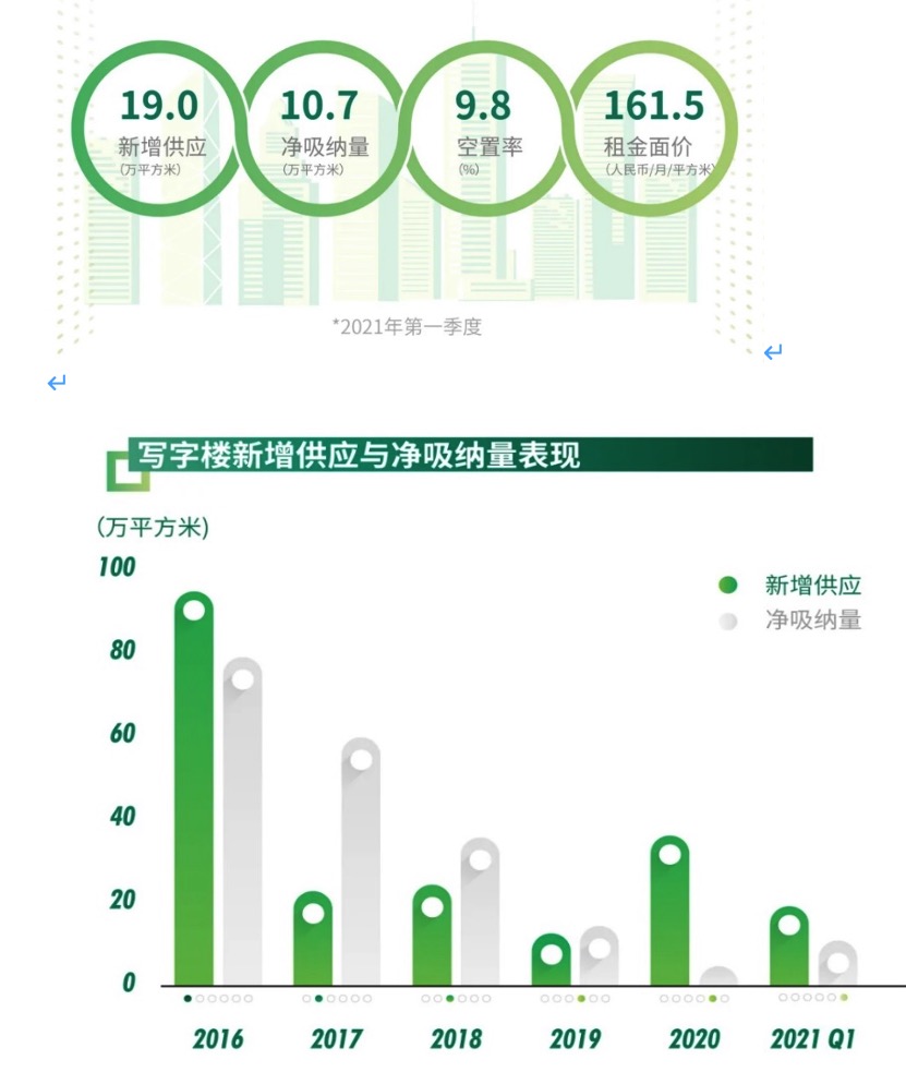 2021年第一季度,位于琶洲的赫基国际中心和天河体育中心的广州环贸中心落成,新增供应总量为19万平方米,单季供应量超过2020年全年供应量的50%,全市空置率环比上升0.8个百分点至9.8%。据了解,广州环贸中心已吸引了多家律师事务所和金融企业等优质租户进驻,包括渣打银行大湾区中心等。