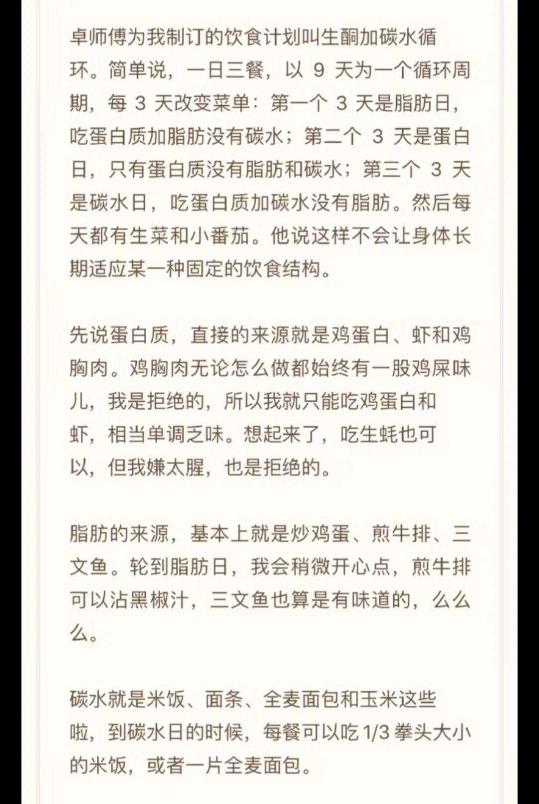 肌肉猛男有点难:“妹妹们千万别学。断食不是小事,几天不吃主食都会影响到下一个月的例假,不来例假会让卵巢萎缩!千万别学!!循序渐进地去锻炼去控制一下饮食是会很健康地瘦下来的!”